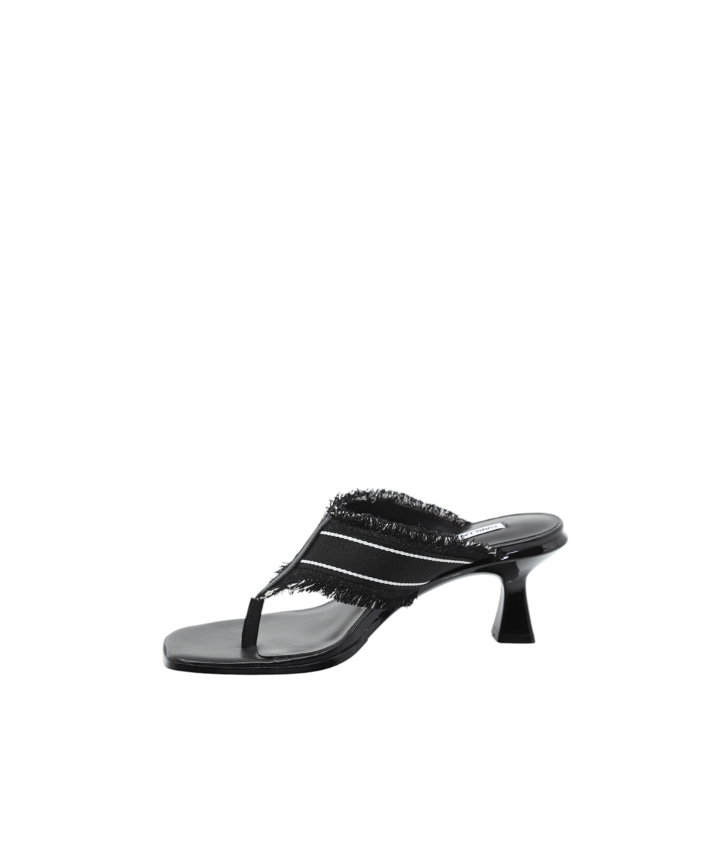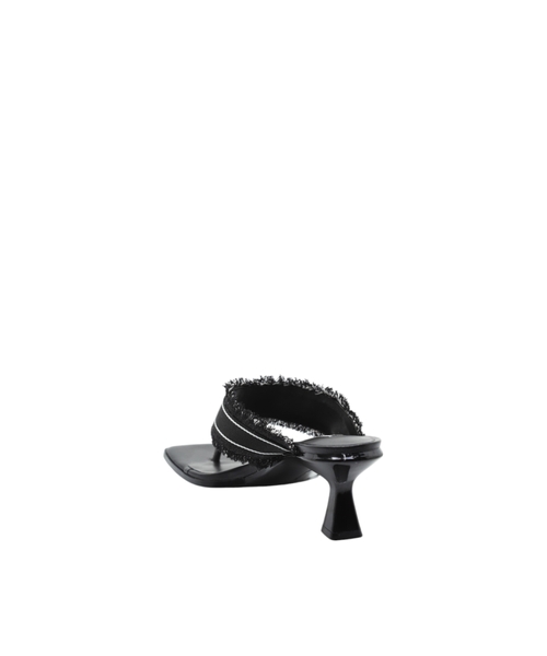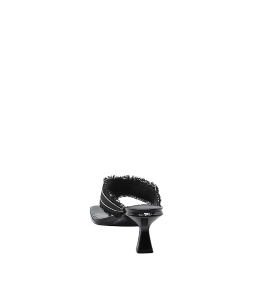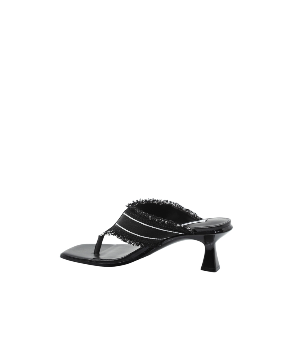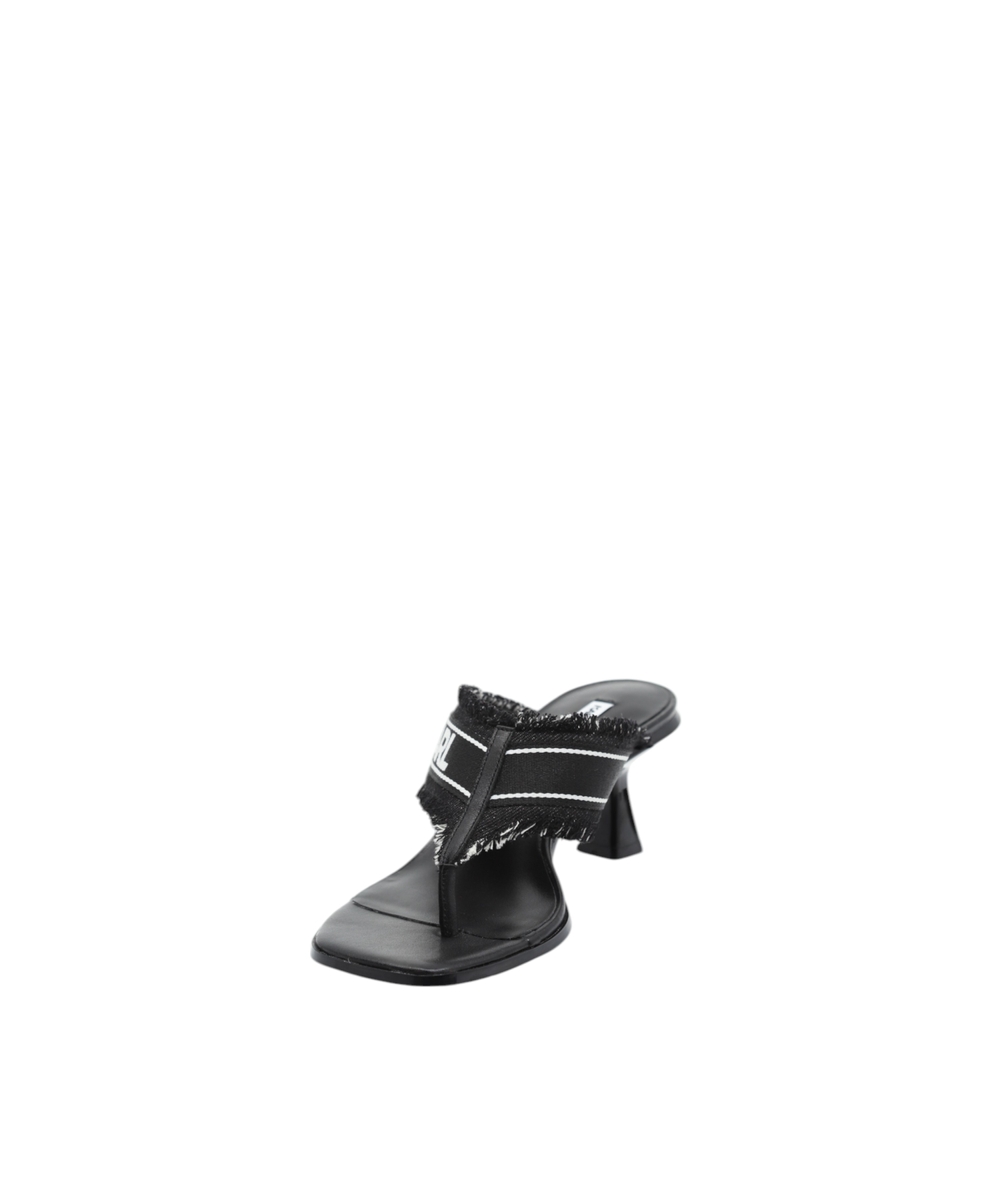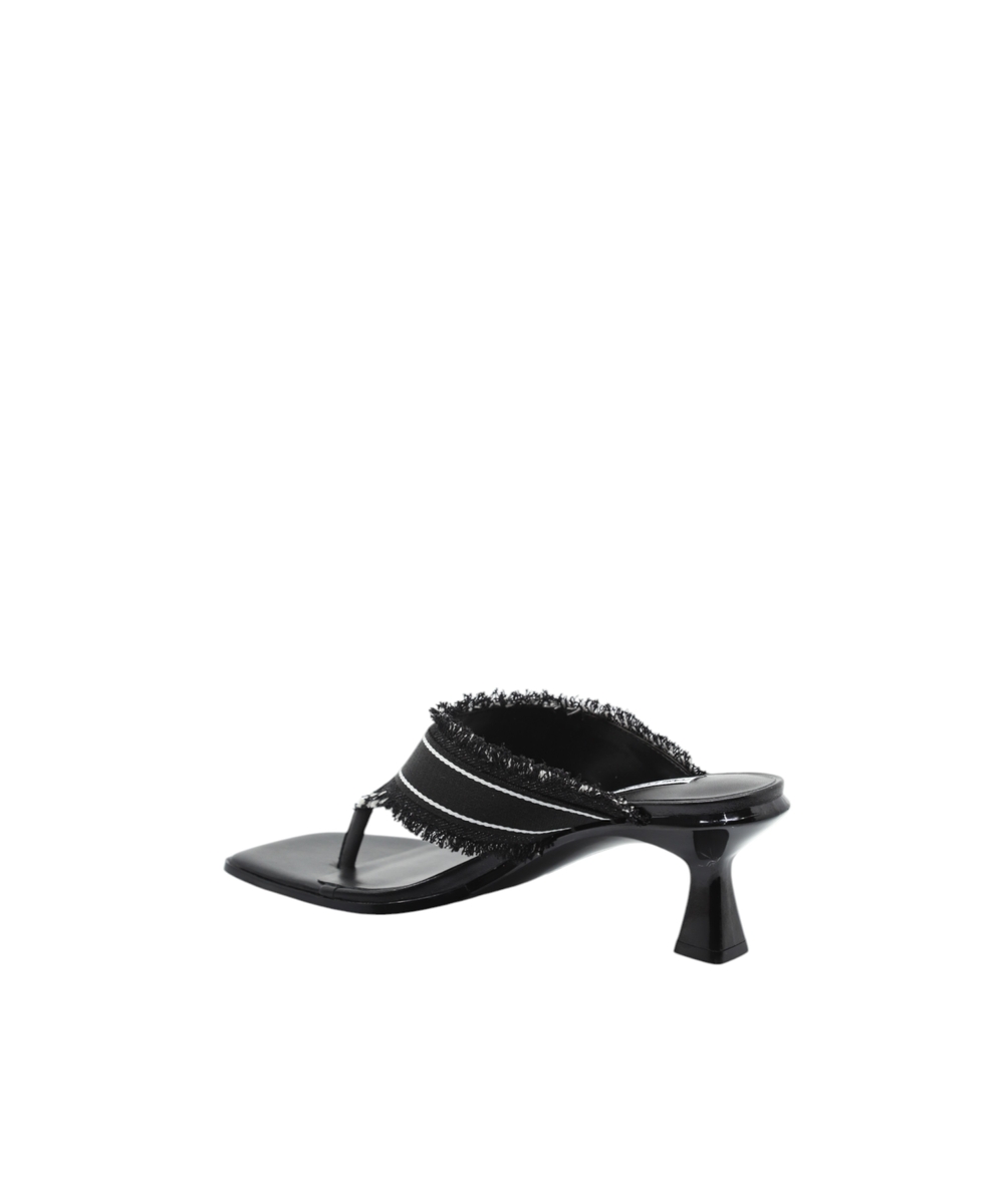 The logo-detailed strap and frayed edges add a unique touch, while the open-toe design and sleek heel structure ensure both comfort and sophistication. A versatile choice perfect for transitioning from day to night.